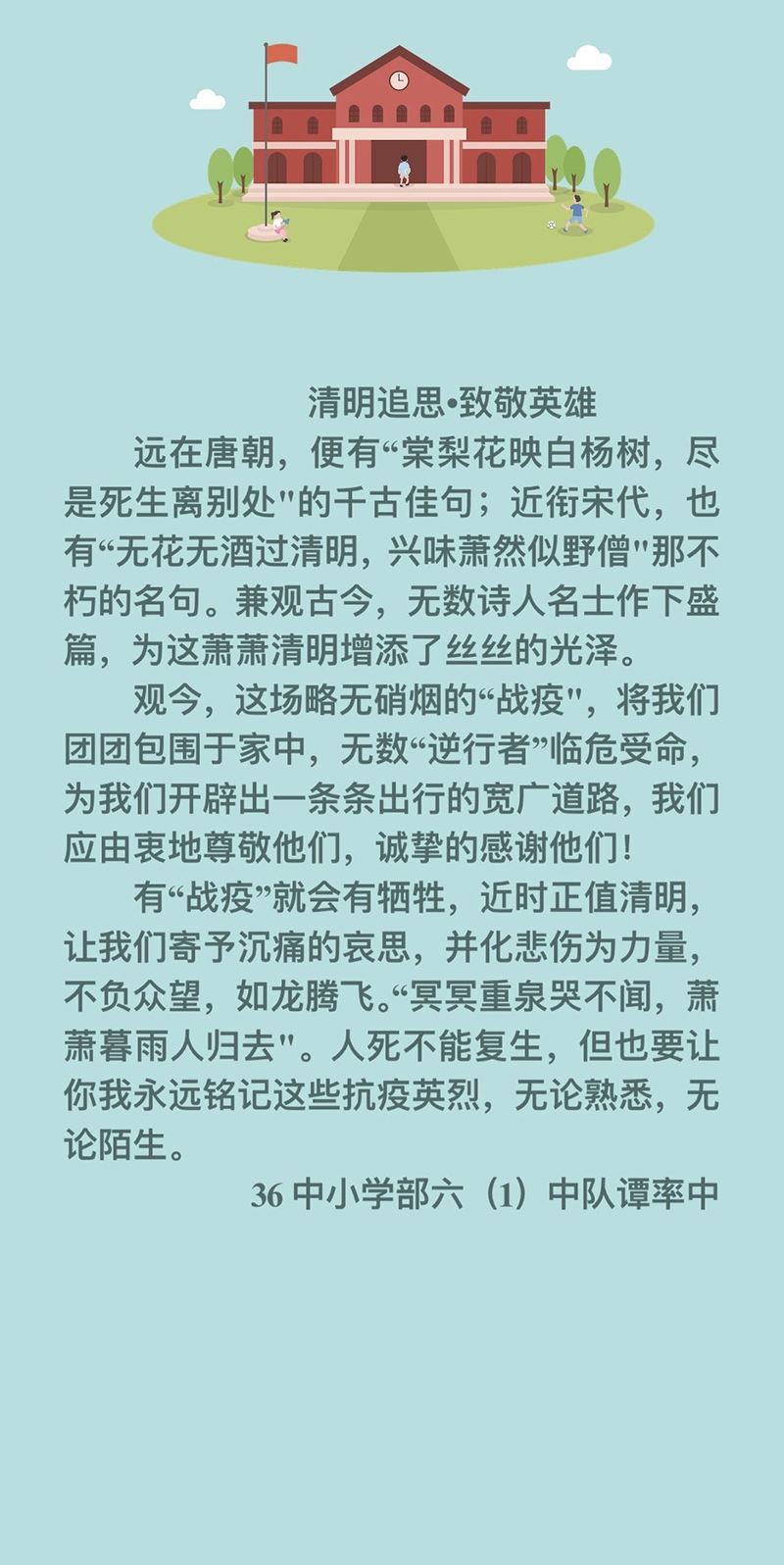 全体学生在哀悼活动结束后统一参加襄阳市36中小学部“学先锋祭英烈”线上清明活动。观看学校发布的美篇视频结束后,请所有同学积极参加线上留言寄语活动。